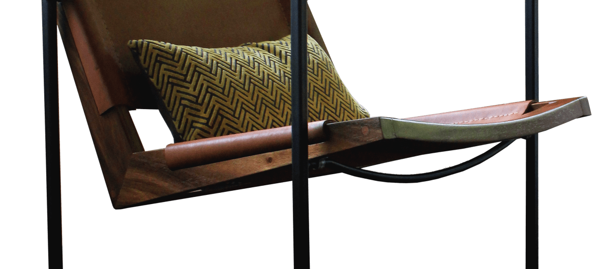 Un estilo clásico y acogedor. El cuero crea una conversación interesante por medio de la relación entre la madera y el hierro. La rigidez del hierro permite un efecto delicado en el marco, mientras sostiene el esqueleto de la madera, como si “flotara.” Las franjas de cuero abrazan la madera, dándole forma al cuerpo de la silla. Se convierten en un elemento único del diseño.